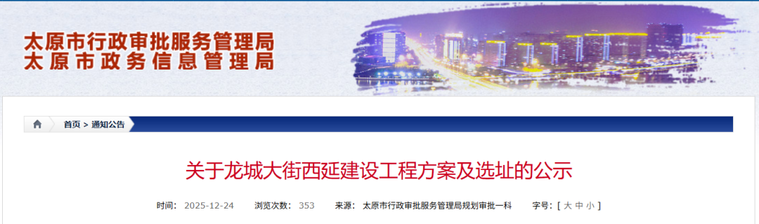 龙城大街西延建设工程西起电厂西路,东至晋阳大道,长约720米,规划红线宽50米,为城市主干路,用地面积约4.3公顷。