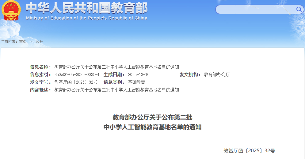 近日,教育部公布第二批中小学人工智能教育基地名单,经各省教育行政部门推荐、教育部集中公示等环节,最终确定了第二批中小学人工智能教育基地325个。其中,陕西共有10所中小学上榜。