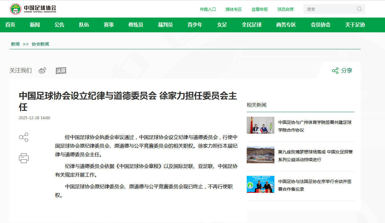 据中国足球协会网站消息,经中国足球协会执委会审议通过,中国足球协会设立纪律与道德委员会,行使中国足球协会原纪律委员会、原道德与公平竞赛委员会的相关职权。徐家力担任本届纪律与道德委员会主任。