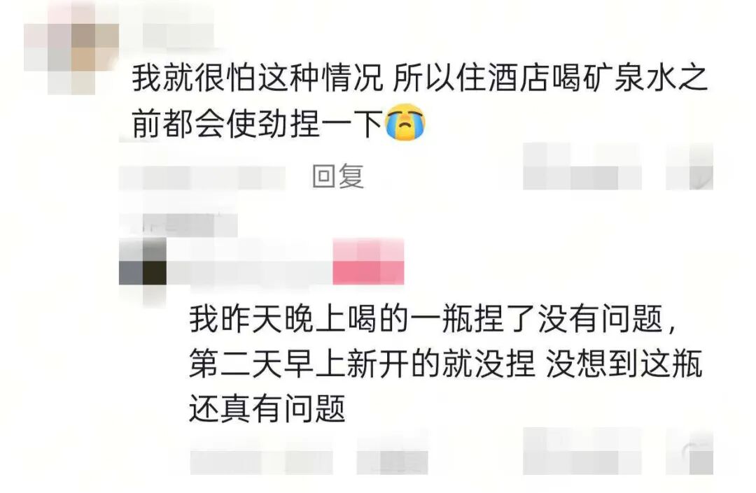 画面显示,一瓶矿泉水有水流喷出,视频发布者称“可怕至极”,视频引发网友讨论,有网友称感到害怕,还有网友表示在酒店喝瓶装水时会习惯性捏一下瓶子,不过另有网友称,这种情况是运输过程中矿泉水瓶身薄所致。