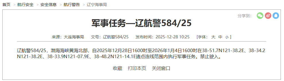 此外,大连海事局消息:辽航警584/25,渤海海峡黄海北部,自2025年12月28日1600时至2026年1月4日1600时在38-51.7N121-38.2E、38-34.2N121-38.2E、38-33.9N121-07.9E、38-48.2N121-14.1E诸点连线范围内执行军事任务。禁止驶入。