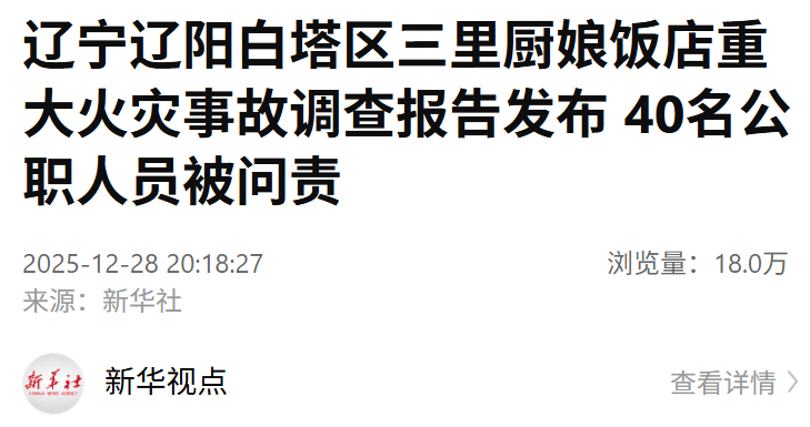 此外,调查报告建议对三里厨娘饭店经营者等8人移送司法机关。辽宁省纪委监委也同步成立火灾事故追责问责审查调查组,依规依纪依法对重大火灾事故中负有责任的40名公职人员进行严肃追责问责。