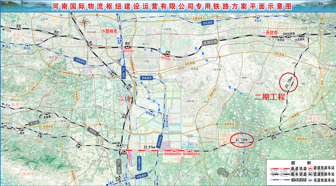 据悉,郑州国际陆港专用铁路利用既有朝杞铁路线位进行建设,一期线路全长23.92km,投资44.9亿元,已建成通车。