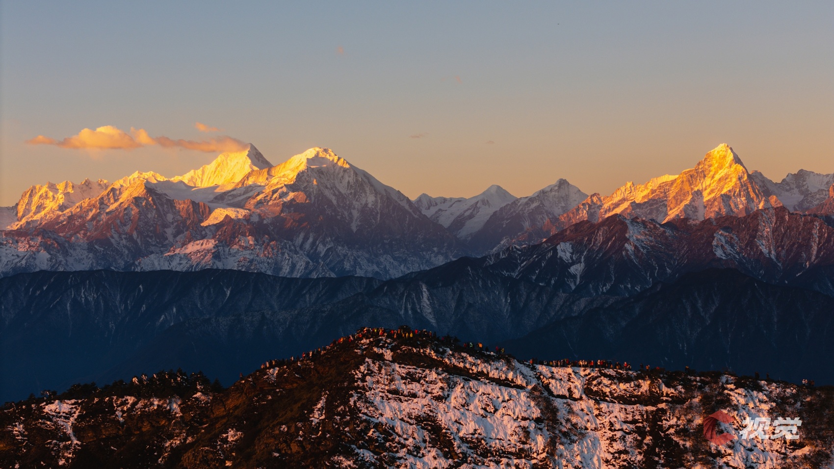 1月1日清晨,在甘孜州泸定县华尖山顶,人们迎接照耀贡嘎雪山的第一缕阳光。C视觉签约摄影师 吴科