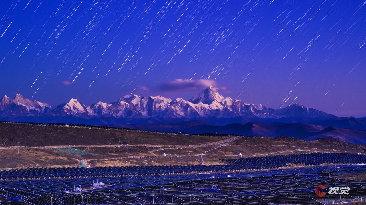 2月10日,甘孜雅江500MW南真光伏电站与贡嘎雪山同框,星河流转,更添震撼。C视觉签约摄影师 田相和