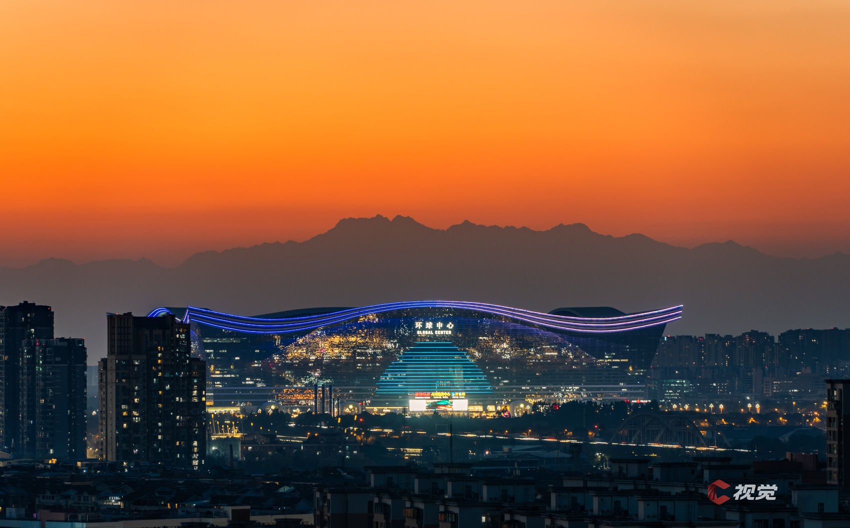 3月24日日落时分,成都标志性建筑环球中心上方,成都最高峰大雪塘剪影清晰可见。C视觉签约摄影师 张晗