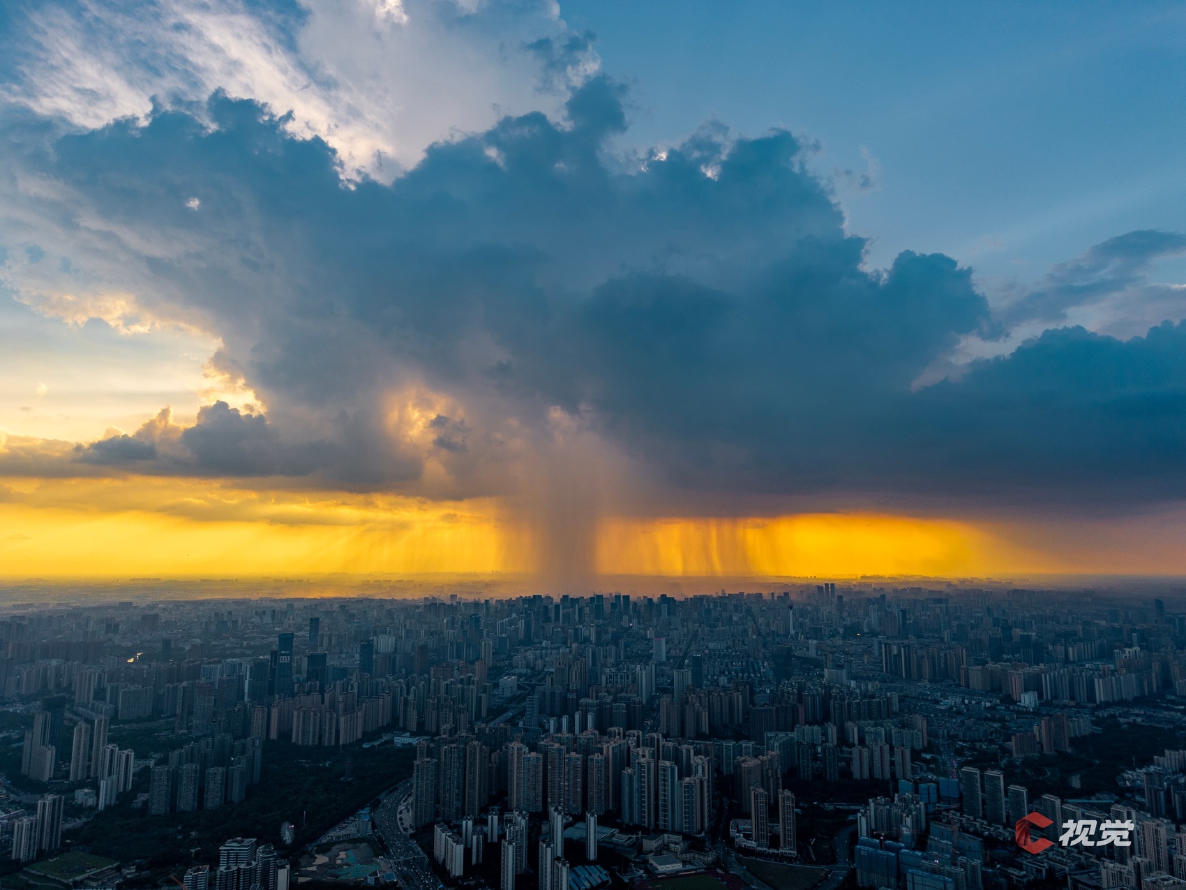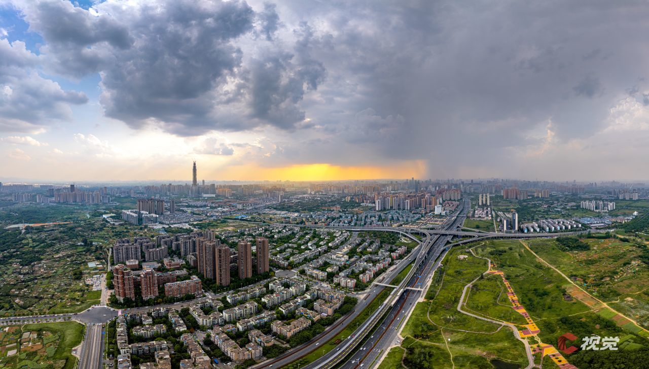 4月20日,成都局部区域突降暴雨,航拍视角下,形成霞光穿透云层的气象景观。C视觉签约摄影师 张云浩