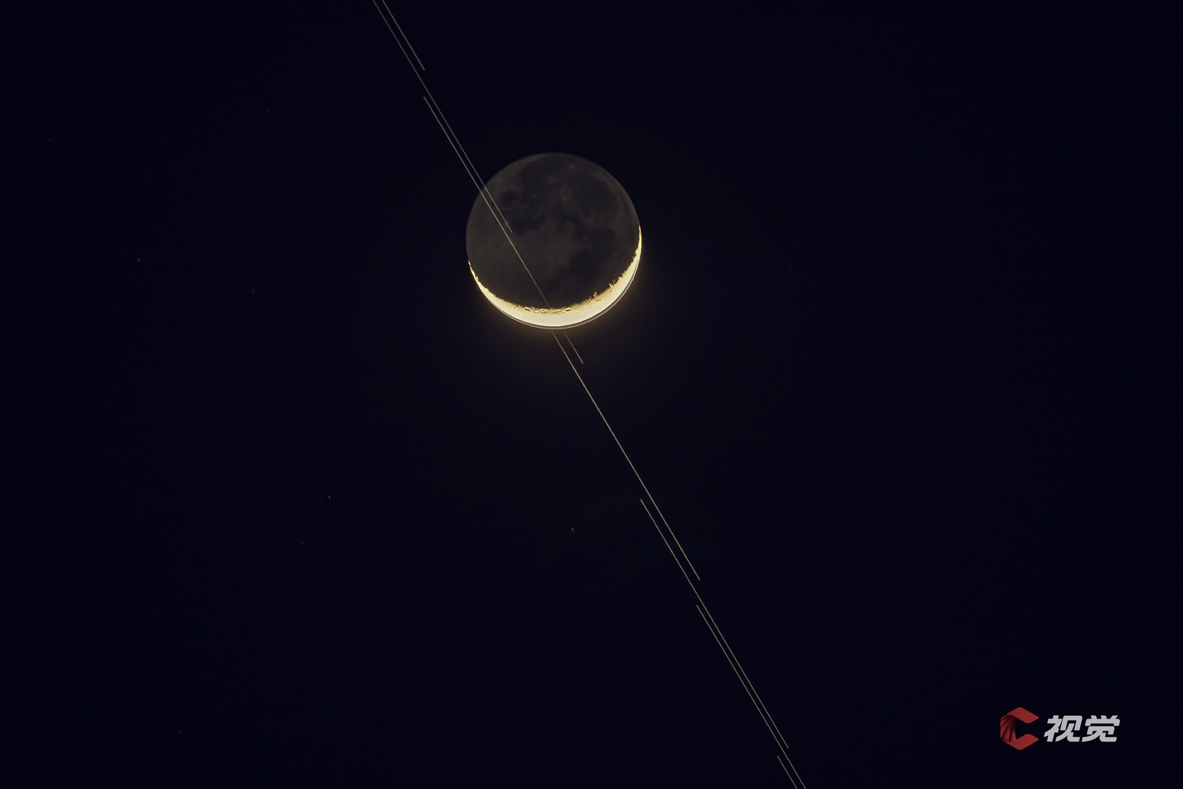 4月30日,成都上空,一轮金色光亮的下弦月正被一组星链卫星轨迹贯穿而过。C视觉签约摄影师 杨栩