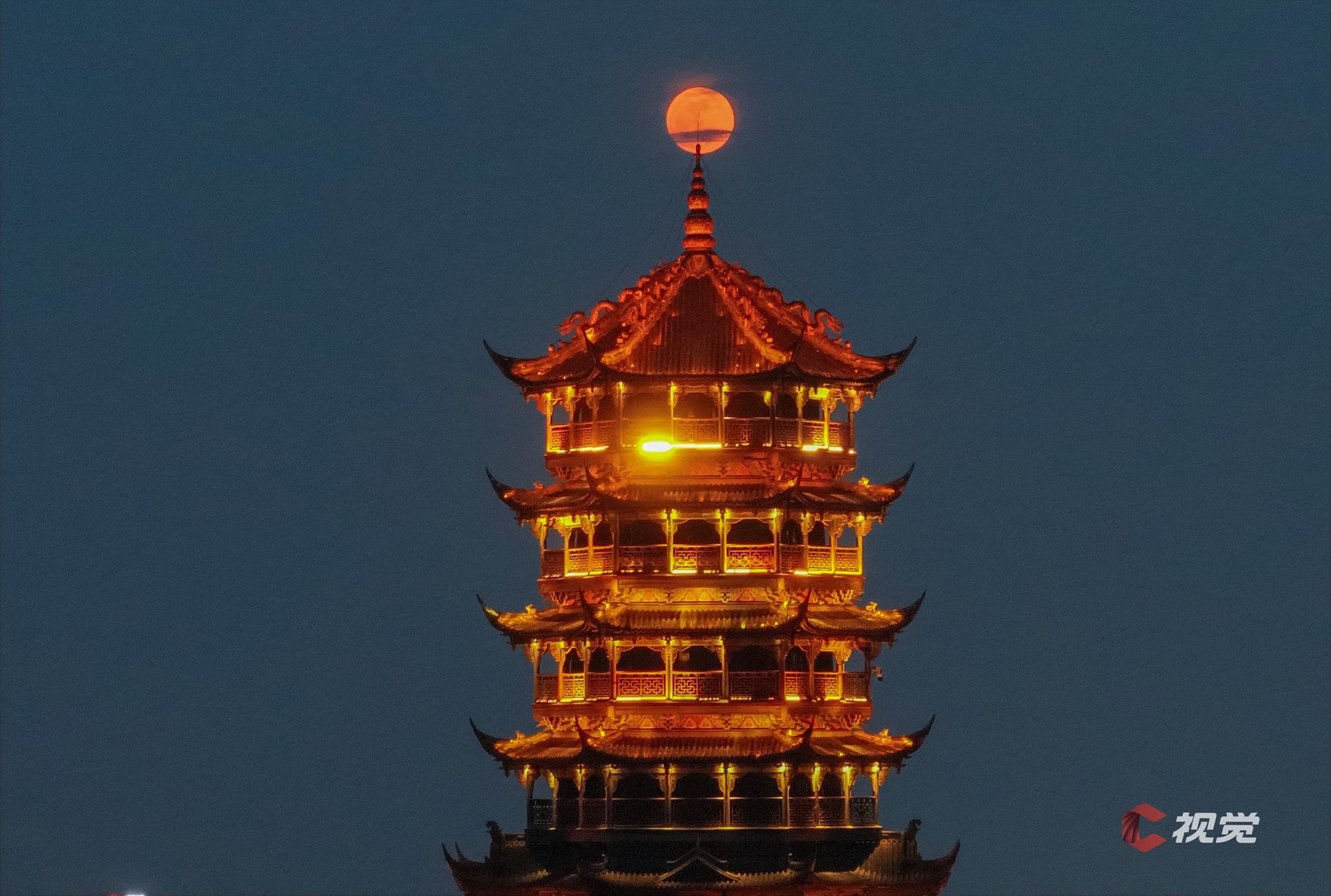 5月12日,一轮红月亮升起,点亮了成都都江堰的玉垒阁。C视觉签约摄影师 王庆新