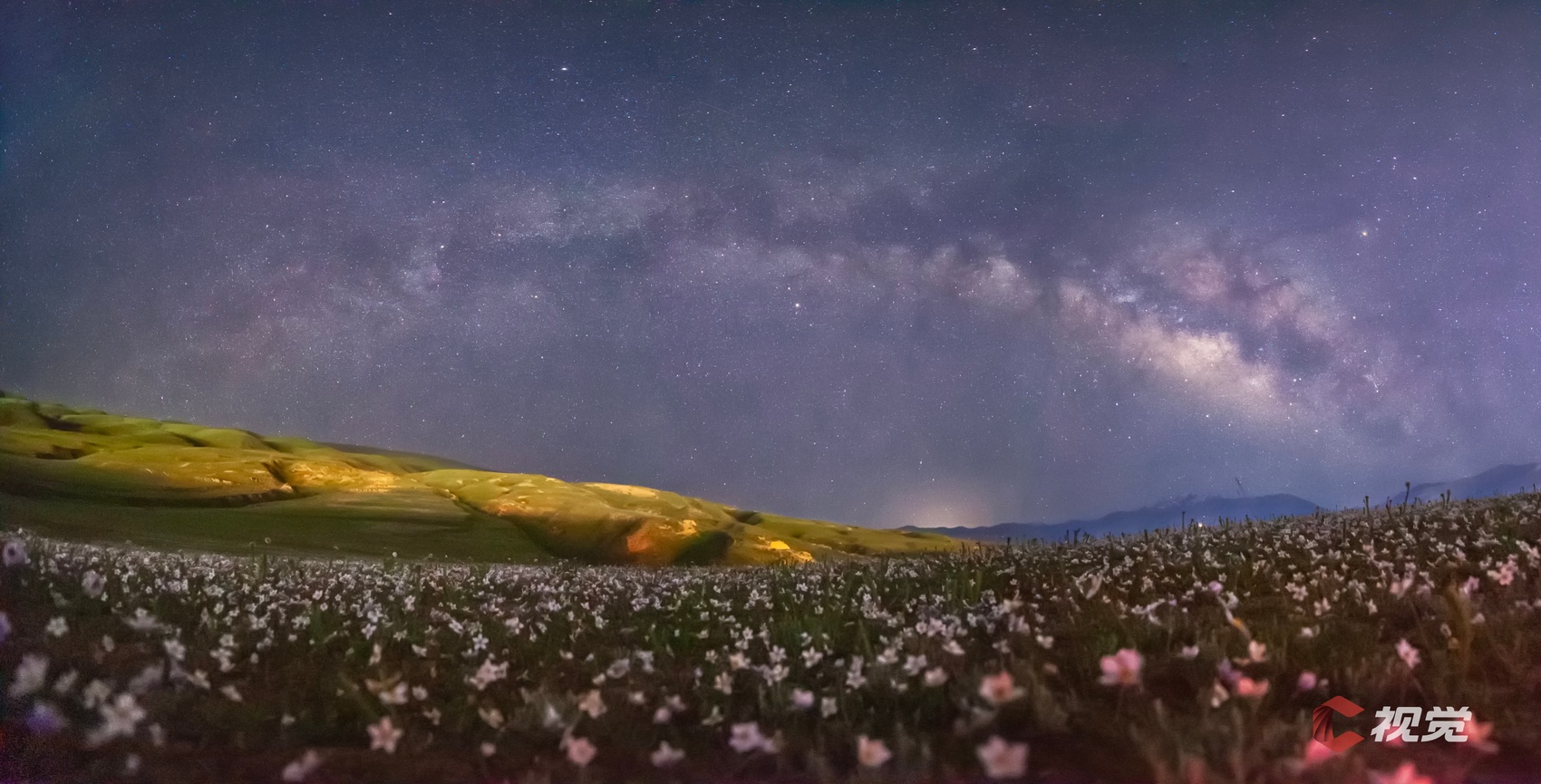 6月22日晚,在甘孜州甘孜县,草原鲜花盛开,银河如同一条拱桥横跨天地间,美不胜收。C视觉签约摄影师 刘炳科