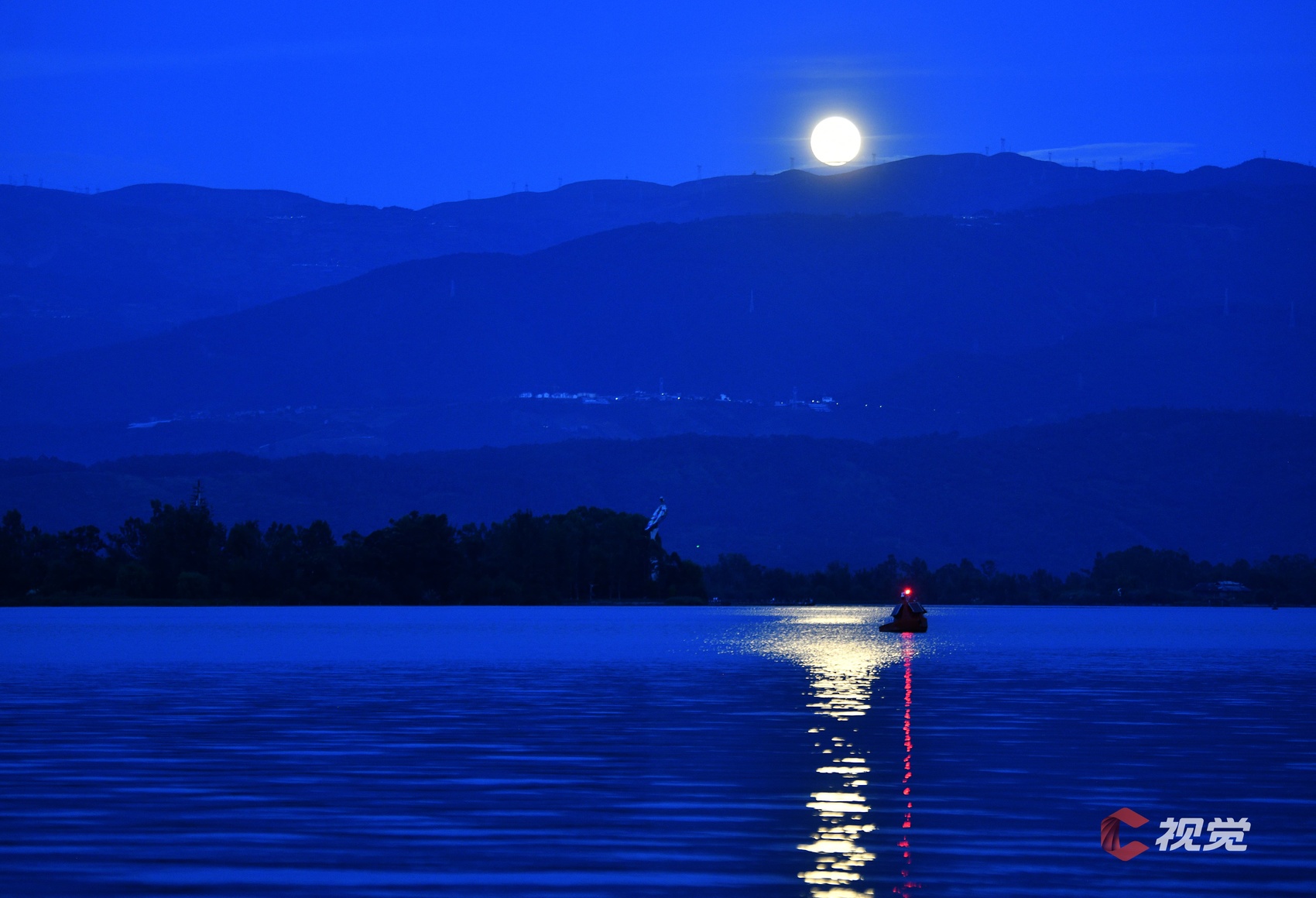 9月7日,满月在凉山州西昌市邛海上空升起,湖水泛出金色涟漪。C视觉签约摄影师 华小峰
