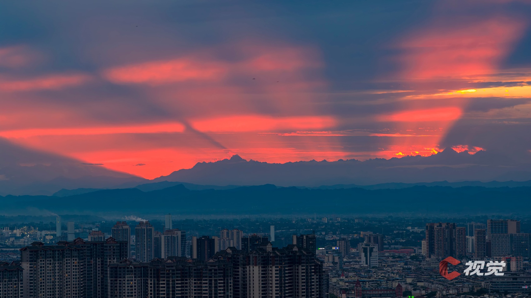 9月12日,眉山市东坡城区,夕阳沉入川西雪山群峰时,犹如熔金泼洒天际,将整片天空染成橙红色。C视觉签约摄影师 李继军