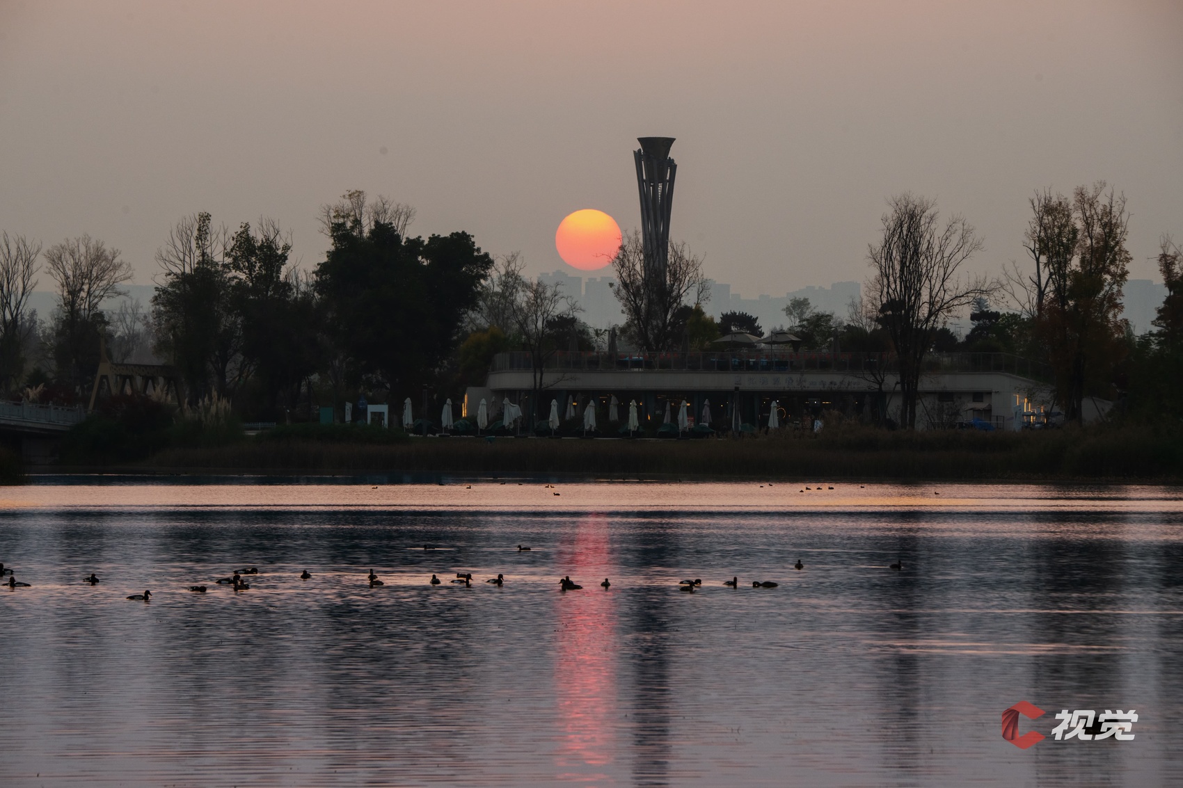 11月27日,柔和的夕阳悬在天际,水鸟在成都东安湖湖面上嬉戏。C视觉签约摄影师 黄太送