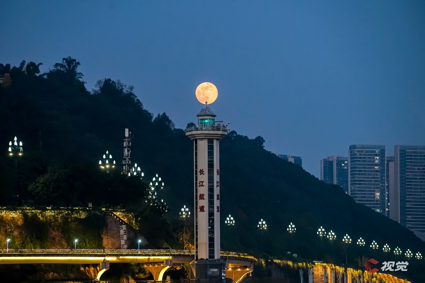 12月4日,年度第二大满月在宜宾长江航标塔上,照亮城市之夜。C视觉签约摄影师 张鉴