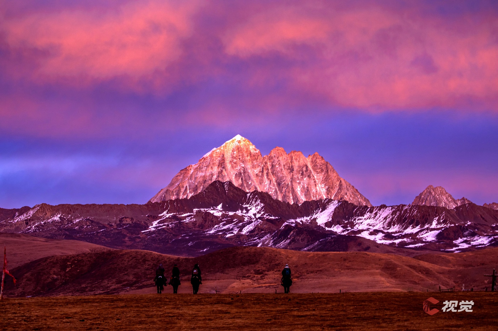 12月20日,在甘孜州康定市塔公镇,雅拉雪山披着粉红色的晚霞,山下,牧民骑着马儿踏上归途。C视觉签约摄影师 秦志伟
