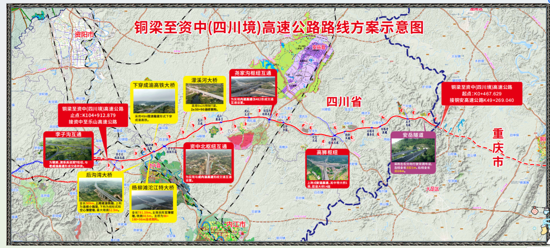 铜资高速项目路线起于安岳县石羊镇,与铜梁至资中(重庆境)高速公路对接,经安岳县、资中县,止于资中县鱼溪镇,与在建的资中至乐山高速公路相接,沿线穿越丘陵河谷、沱江二级水源保护区等复杂区域,桥梁工程占比高。