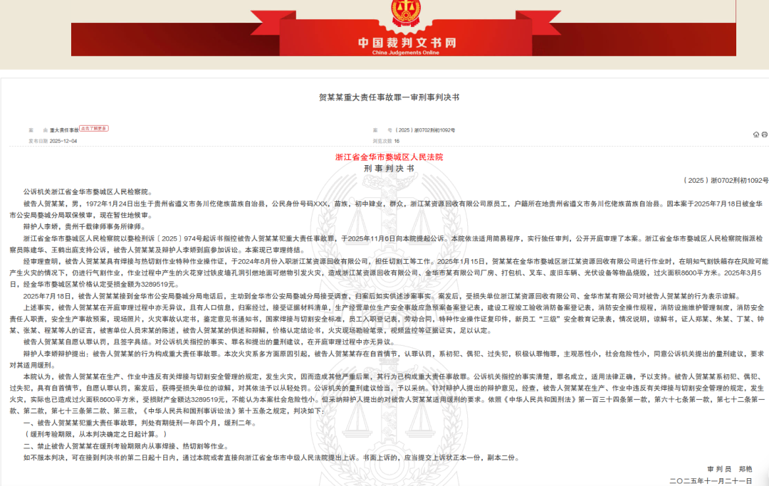 今年1月15日,贺某某在婺城区一企业内进行动火作业。贺某某虽持有焊接与热切割作业特种作业操作证,但在明知气割铁箱存在火灾风险的情况下,仍违规操作。