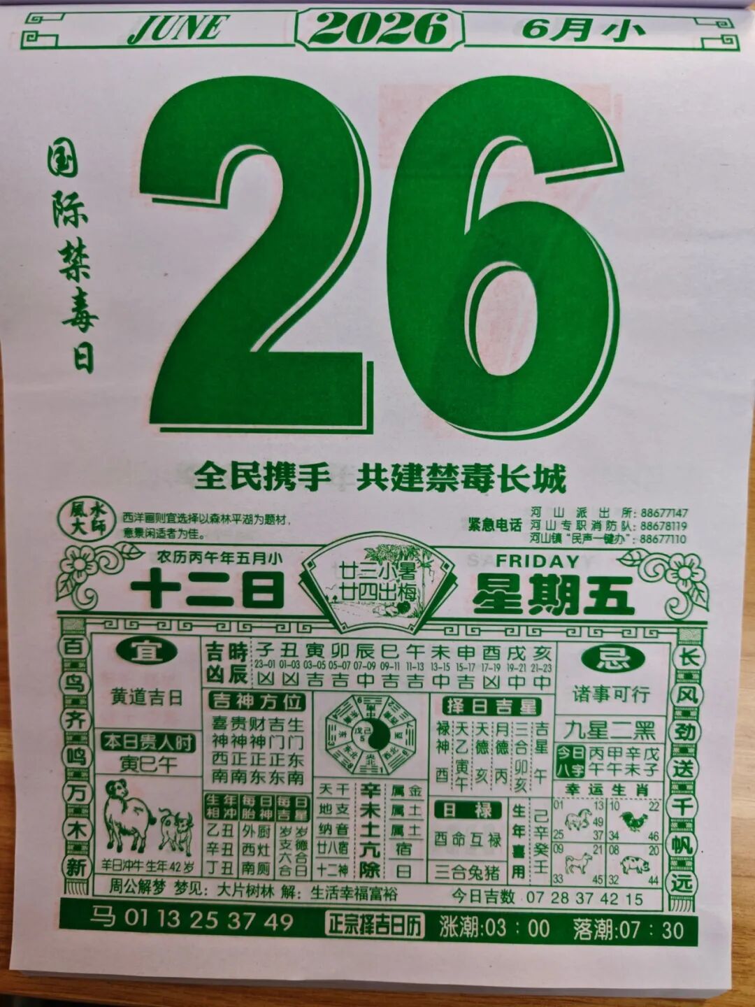 此次定制的禁毒平安日历设计兼具实用性与警示性:内页除清晰标注公历日期、节气、节假日等实用信息外,更以“珍爱生命、远离毒品”为核心主题,醒目印着“全民禁毒,共建禁毒长城”,在6月26日标注“国际禁毒日”,让群众在每日翻阅、标注日程的日常点滴中,潜移默化绷紧禁毒这根弦。
