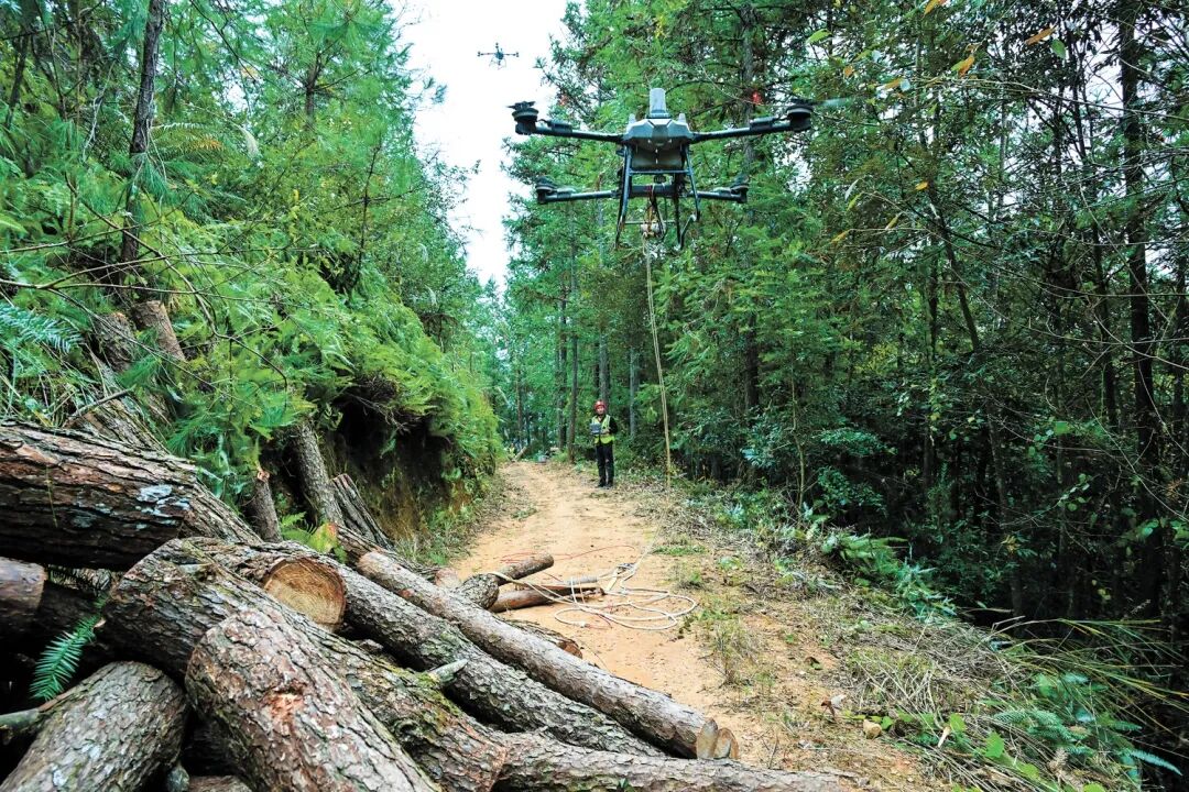 武夷山国家公园无人机吊运松木现场