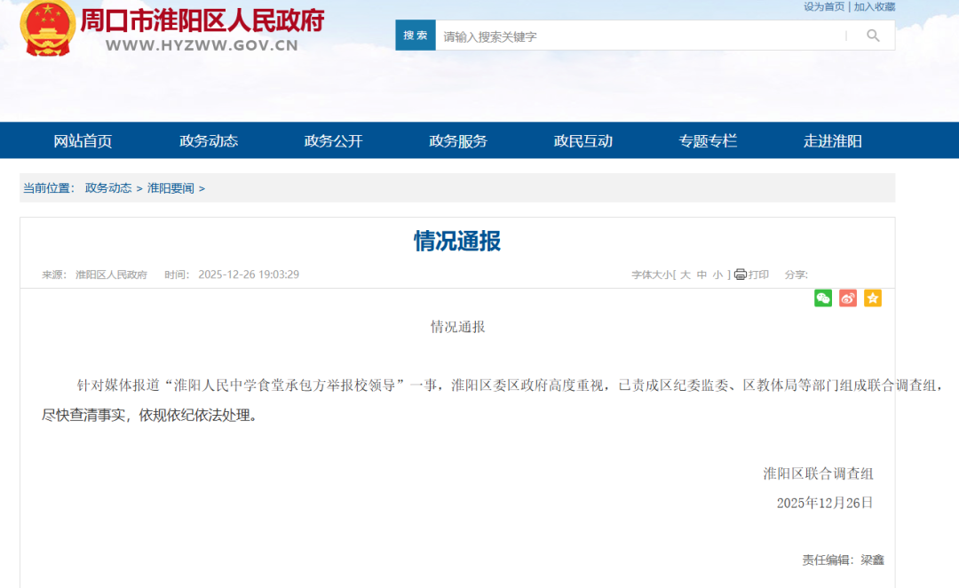 针对媒体报道“淮阳人民中学食堂承包方举报校领导”一事,淮阳区委区政府高度重视,已责成区纪委监委、区教体局等部门组成联合调查组,尽快查清事实,依规依纪依法处理。