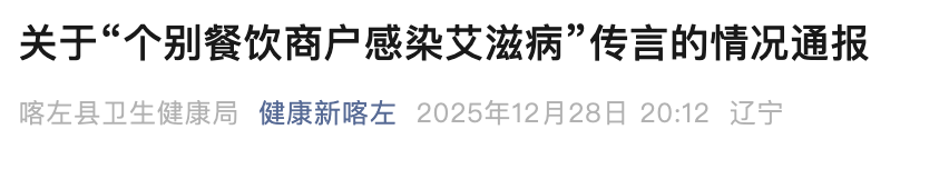 12月28日,辽宁朝阳喀左县(喀喇沁左翼蒙古族自治县)卫生健康局与喀左县公安局发布关于“个别餐饮商户感染艾滋病”传言的情况通报。