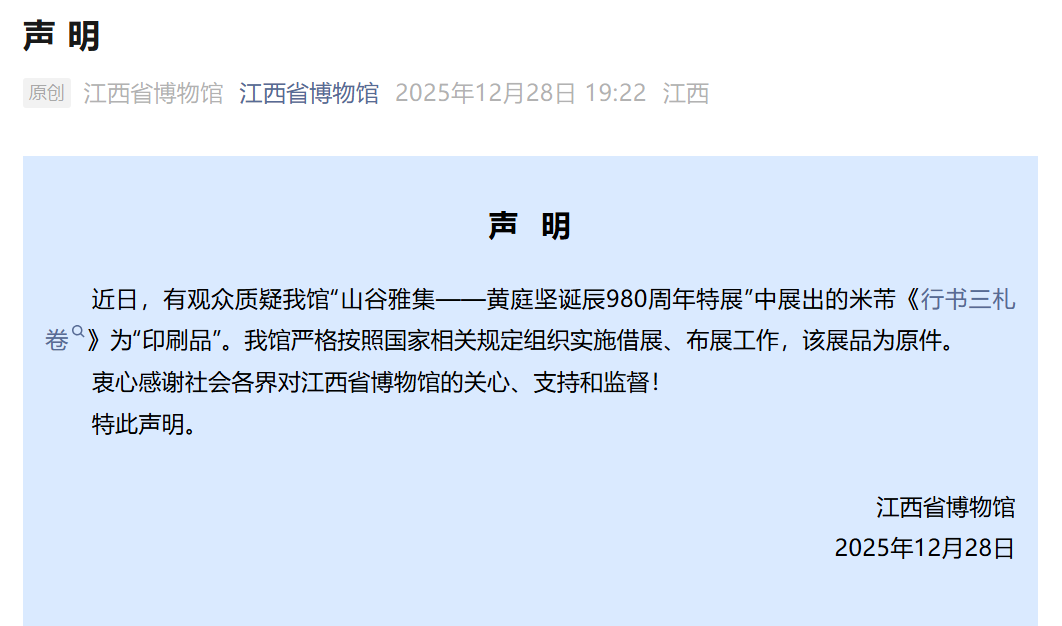 12月28日下午,江西省博物馆发布声明,声明称,有观众质疑我馆“山谷雅集——黄庭坚诞辰980周年特展”中展出的米芾《行书三札卷》为“印刷品”。我馆严格按照国家相关规定组织实施借展、布展工作,该展品为原件。