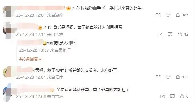 这番经历曝光后,网友纷纷留言心疼,有人直呼“缝了43针听着都头皮发麻,太心疼了”,更有网友称赞他“历经重病依旧高能量,黄子韬内娱拼命三郎”“心疼黄子韬遭这份罪,术后满血回归太牛了”。