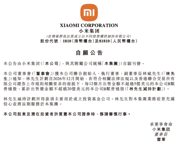 12月28日,小米集团发布公告称,公司联合创始人、执行董事、副董事长林斌计划自2026年12月开始,每12个月出售金额不超过5亿美元的公司B类普通股,累计出售总金额不超过20亿美元(约合人民币140亿元)。