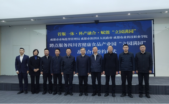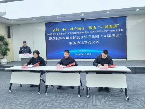 12月25日,四川省健康食品产业园“立园满园”蹲点服务战略合作签约仪式在成都市新津区举行。成都市市场监管局、成都农业科技职业学院与新津区共同签署三项合作协议。这标志着“部门+区县+院校”三合一蹲点服务模式正式落地,助力将该园区打造成具有全国影响力的现代化食品产业高地。