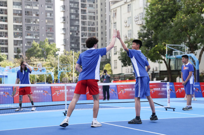 4月15日,在深圳市南山外国语学校(集团)高新中学,中美学生结对进行匹克球双打比赛。新华社记者 梁旭 摄