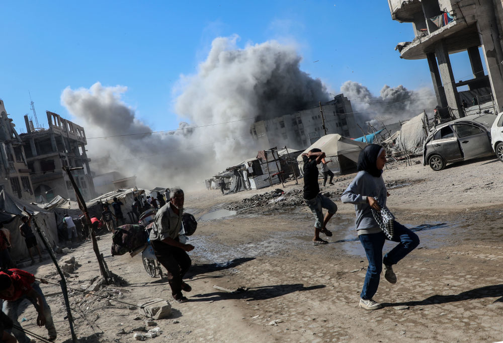 加沙城一座高层建筑遭以色列军队空袭后升起浓烟,民众纷纷躲避(9月8日摄)。新华社发