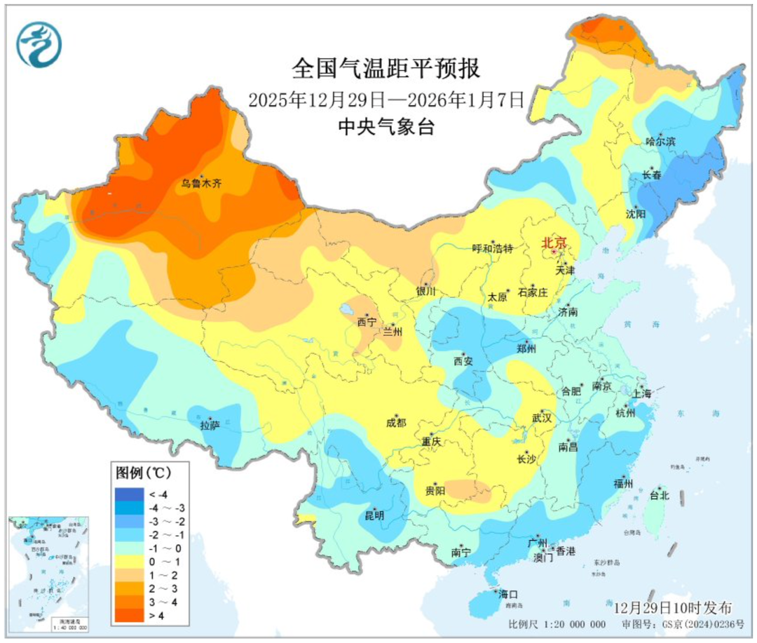中央气象台的预报显示,2025年12月30日-2026年1月2日,受冷空气影响,黄河以南大部气温将下降6-8℃,局地降温10℃以上,并伴有4-6级偏北风。