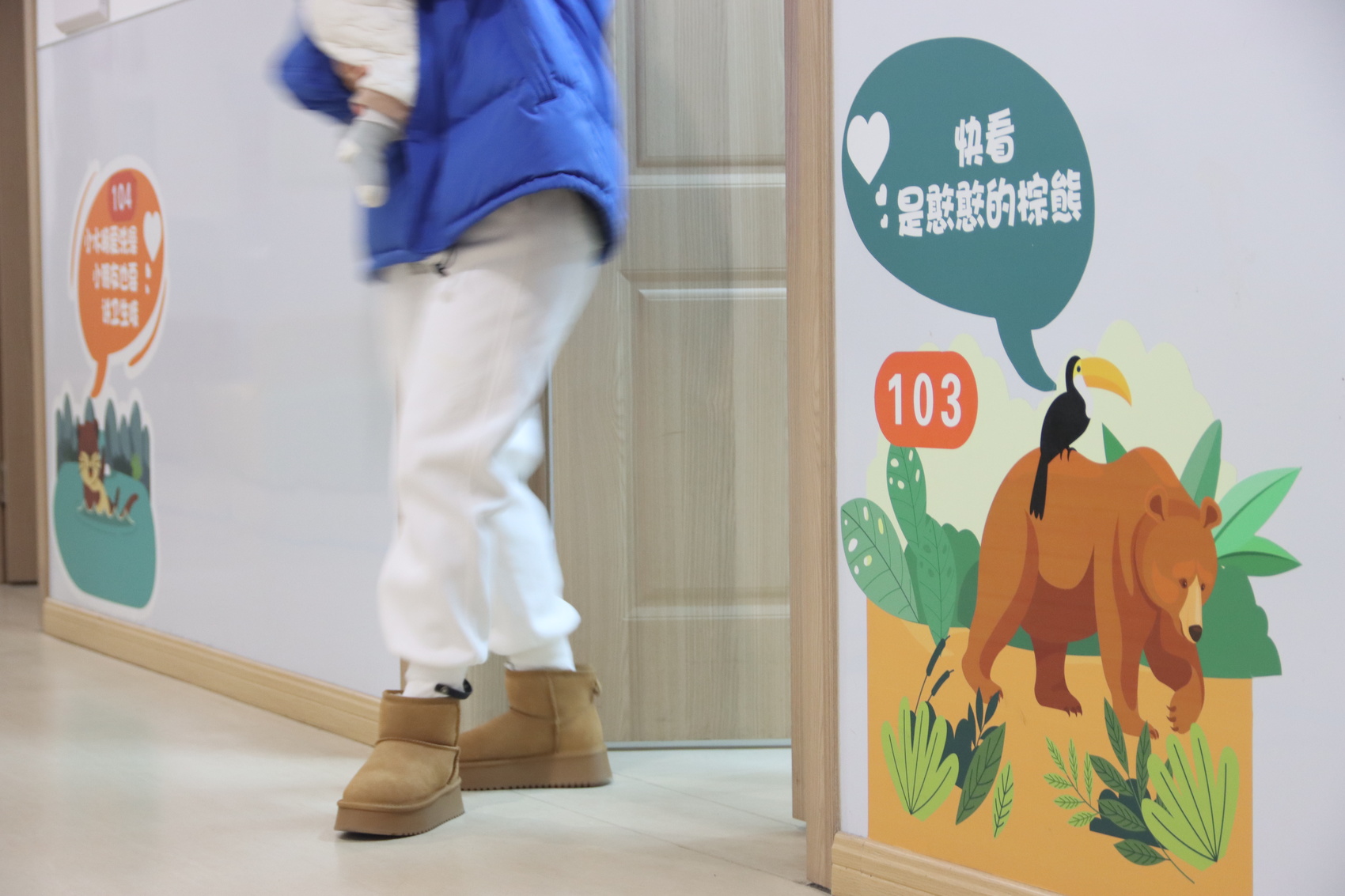 在成都市金牛区妇幼保健院二号楼儿童保健科走廊里,一名小朋友牵着妈妈的手,指着地面上的彩色箭头兴奋地说:“妈妈,我们要去小刺猬的房间。”不远处,诊室门上的卡通刺猬标识格外醒目。
