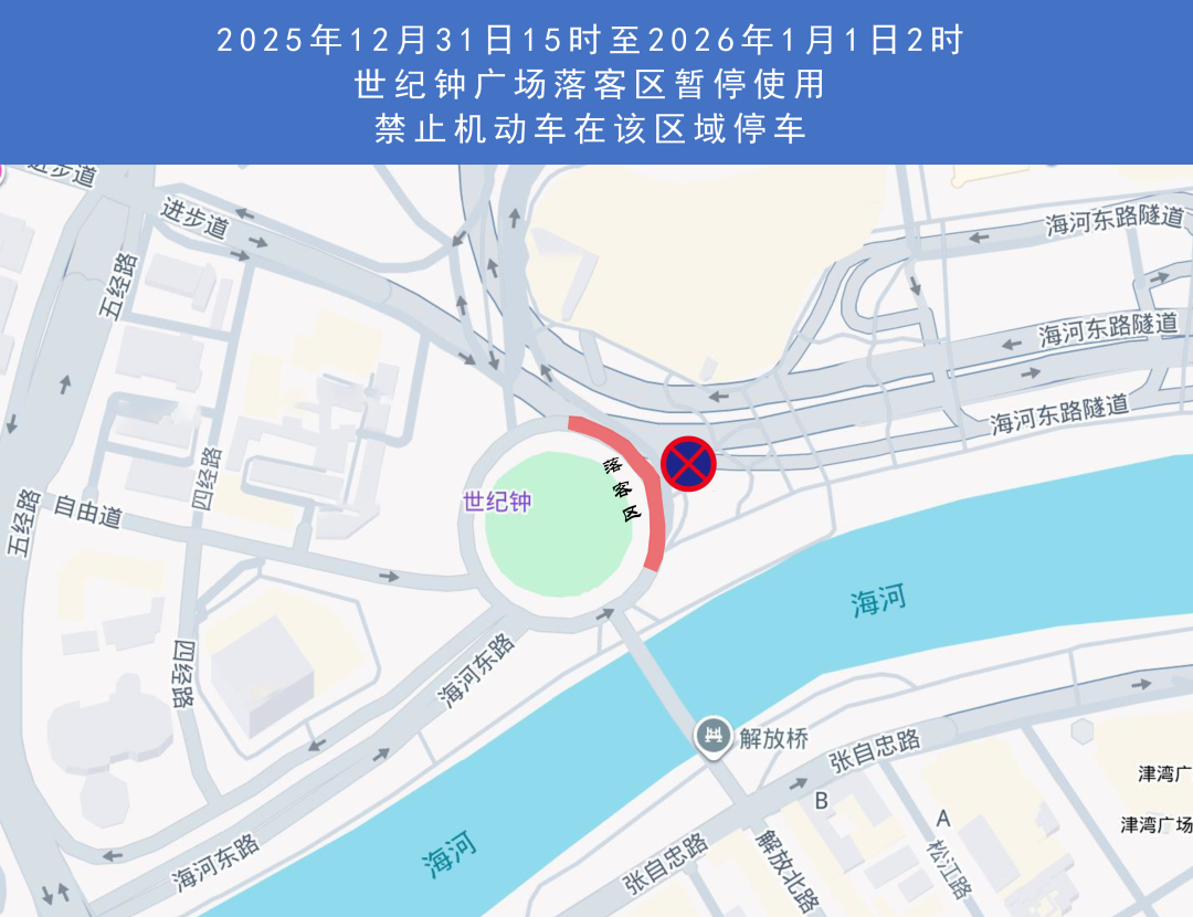 2025年12月31日15时至2026年1月1日2时世纪钟广场落客区暂停使用,禁止机动车在该区域停车,赴天津站送乘客车辆可由海河东路隧道落客区和天津站后广场华兴道地下隧道落客区送乘客。