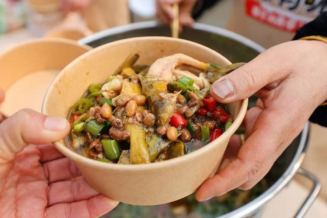启动仪式后,整条“黄辣丁第一街”彻底化身冬日美食与文化的乐园。街道两侧,数家参展商家早已准备就绪,不仅有彭大姐、宋家等黄辣丁餐饮名店,也汇聚了特色餐饮,玛王农业等本地优质农产品品牌和新津中药咖啡、蕃薯藤TINA面包等特色美食,现场展示展销,人气十足。最引人注目的,莫过于现场设立的“百斤黄辣丁免费品尝区”。红烧的浓油赤酱、清汤的原汁原味、豆豉的咸香扑鼻……多种口味供市民凭券取用,长长的队伍蜿蜒开来,大家翘首以盼,只为第一时间尝到这口热乎的“新津鲜”!