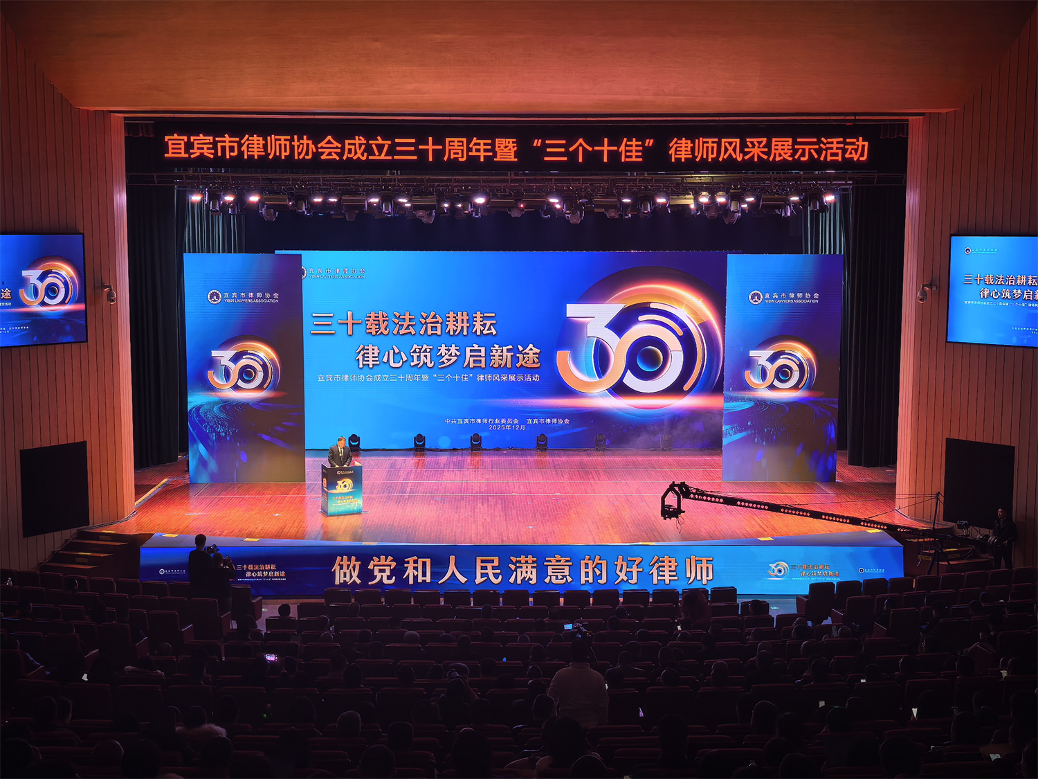 12月28日晚,宜宾市律师协会成立30周年暨“三个十佳”律师风采展示活动在宜宾国际会议中心长江剧场举行。省司法厅党委委员、省律师行业党委书记潘奇峰,省律师协会会长李世亮、监事长刘才伟等受邀出席。