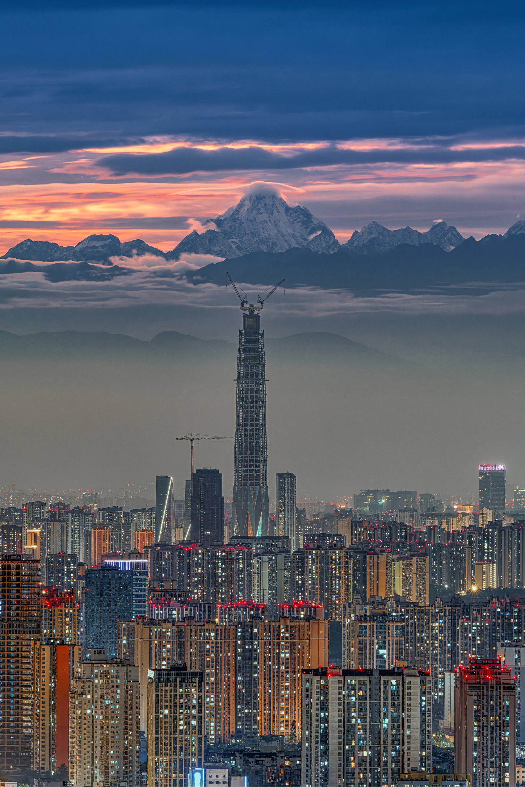 嘉楠在龙泉山顶拍摄的城市与雪山同框