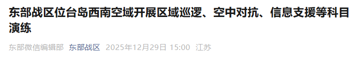 12月29日,中国人民解放军东部战区位台岛西南空域,组织歼击机、预警机、电子战飞机、无人机等兵力,开展区域巡逻、空中对抗、信息支援等科目演练,检验了多机种协同、夺取空中制权能力。