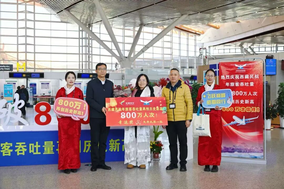 12月29日,拉萨贡嘎国际机场抽取了第800万名幸运旅客,工作人员与旅客合影。