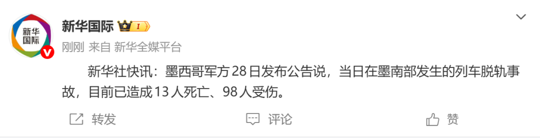 新华社快讯:墨西哥军方28日发布公告说,当日在墨南部发生的列车脱轨事故,目前已造成13人死亡、98人受伤。