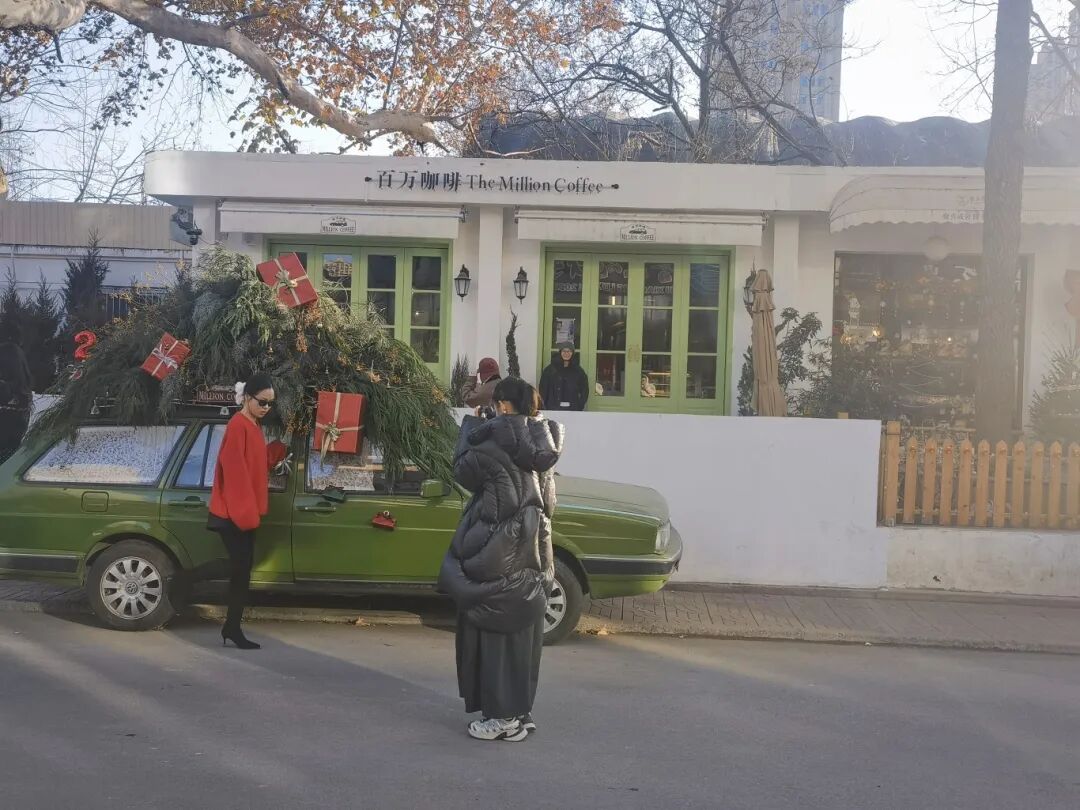 电厂街火了,在小红书APP的同城热门打卡地上,电厂街变成了众多本地用户纷纷前去打卡游览的地点,其中最火的当数街上一家名为“百万咖啡”的咖啡馆,店铺外墙和门窗都采用了明艳的浅绿色涂料,门口则停放着一辆绿色老式桑塔纳轿车作为标志性装置,与绿色门窗形成呼应。这辆绿色桑塔纳也成了社交媒体上被人分享合照最多的“景点”。