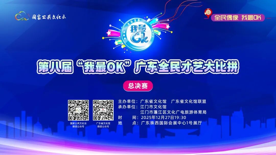 12月27日19:30,第八届“我最OK”广东全民才艺大比拼总决赛将在广东省江门市蓬江区广东珠西国际会展中心1号展厅举办,国家公共文化云全程直播。