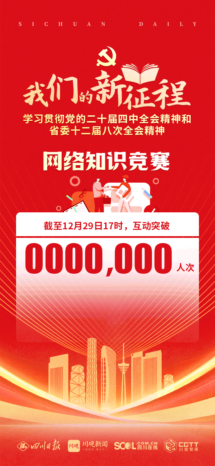 自“我们的新征程”网络知识竞赛12月22日启动以来,全省广大党员干部群众积极参与,踊跃答题,涌现出了一大批答题好手。截至12月29日17时,互动突破5000000人次!