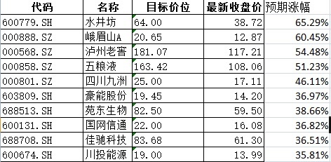金融投资报记者注意到,就四川省来看,近期已有40多只川股获得券商的最新评级,并对其中的26只川股给予了最新目标价。统计数据显示,水井坊、峨眉山A、泸州老窖等大消费行业的上市公司预期涨幅靠前。