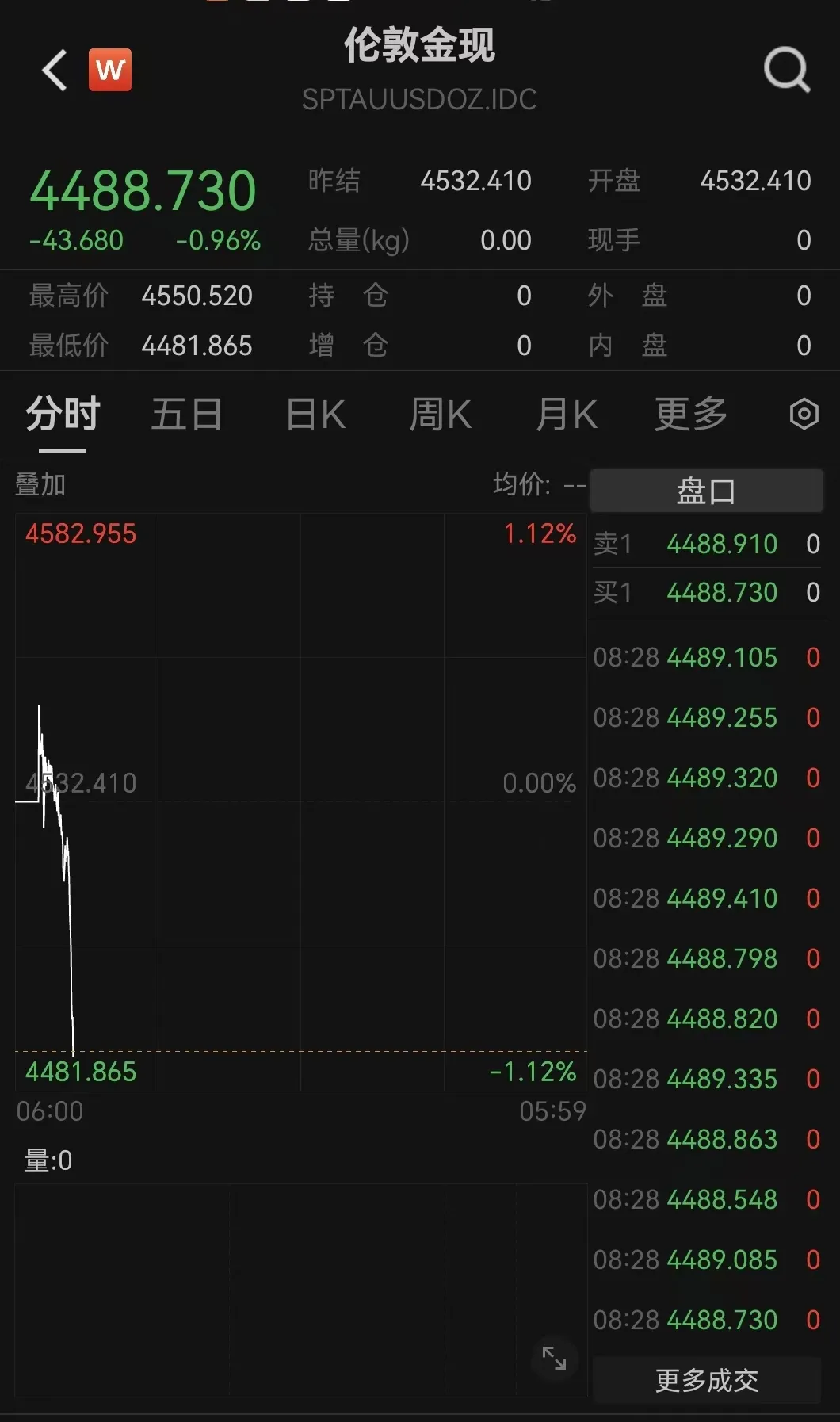12月29日,现货白银大跳水,现跌近5%,此前一度涨近6%;现货黄金失守4500美元关口,现跌近1%。