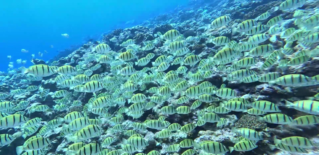 熊小飞:2025年5月至6月,我们综合利用船舶走航、潜水调查、卫星航空遥感、原位观测等方式,开展了黄岩岛生物生态、水文气象、海洋化学、海洋地质等多学科调查。在最新的这次现场调查中,我看到了非常漂亮的“海底热带雨林”——珊瑚礁。黄岩岛的珊瑚礁生态系统有造礁石珊瑚13科36属135种。我还看到了让人印象深刻的“海底草原”,在潟湖北部有连片繁茂的海草床。