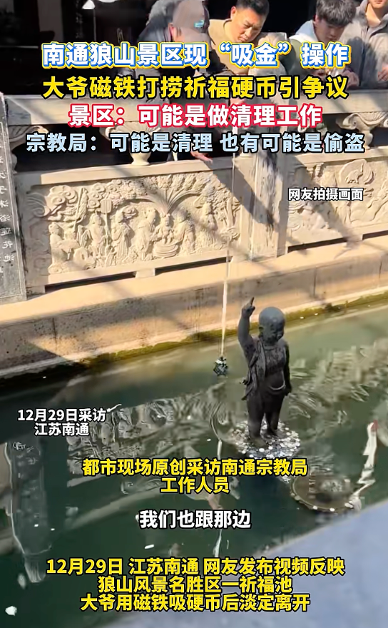 12月29日,网友发布视频反映,江苏南通狼山风景名胜区一祈福池,有位大爷用磁铁吸硬币后淡定离开。