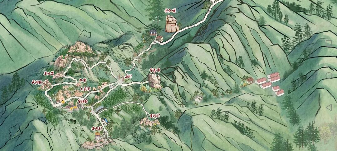 步行上山路线:华楼游览区停车场→ 迎仙岘→ 山门 →(右拐)玉女盆→仙岩→灵烟崮→玉皇洞→山门→华表峰→山门→(左拐)华楼宫→南天门→东天门→山门→返回华楼游览区停车场