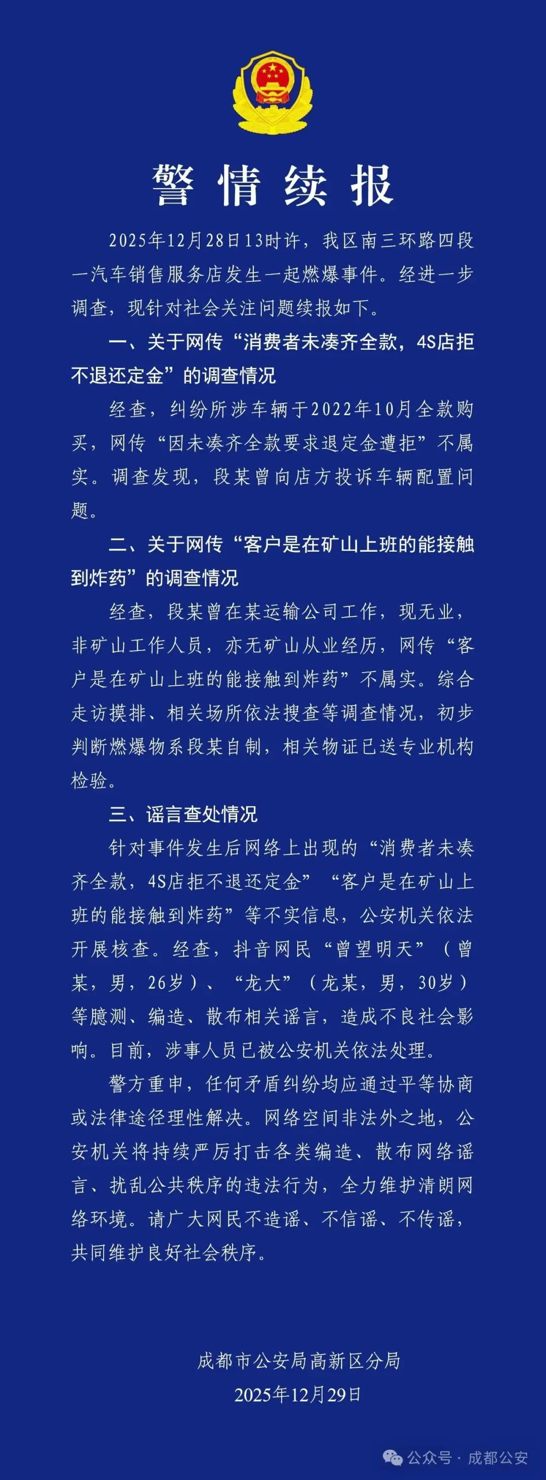 2025年12月28日13时许,我区南三环路四段一汽车销售服务店发生一起燃爆事件。经进一步调查,现针对社会关注问题续报如下。