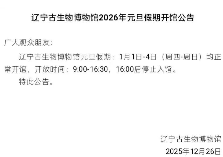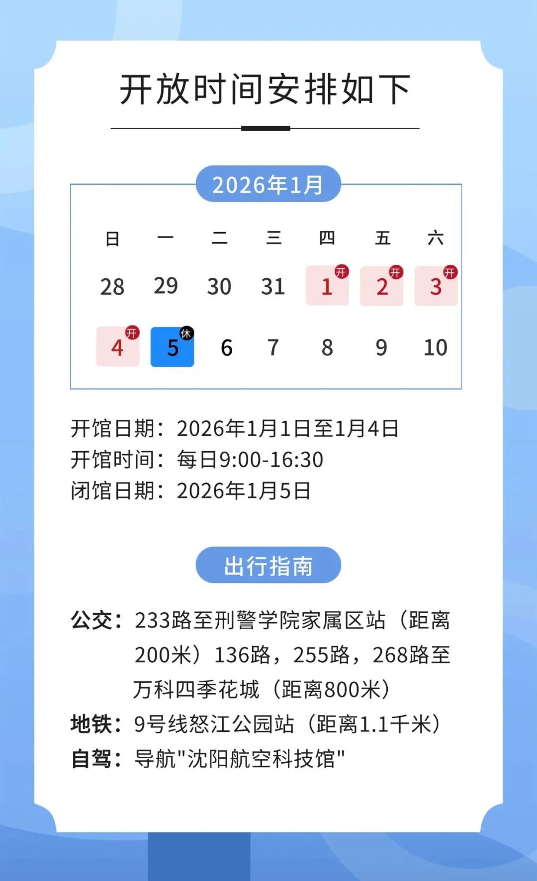 1月1日—1月3日,沈阳故宫博物院(沈阳市沈河区沈阳路171号)、沈阳故宫文化博物馆(沈阳市沈河区朝阳街131号)正常开放。